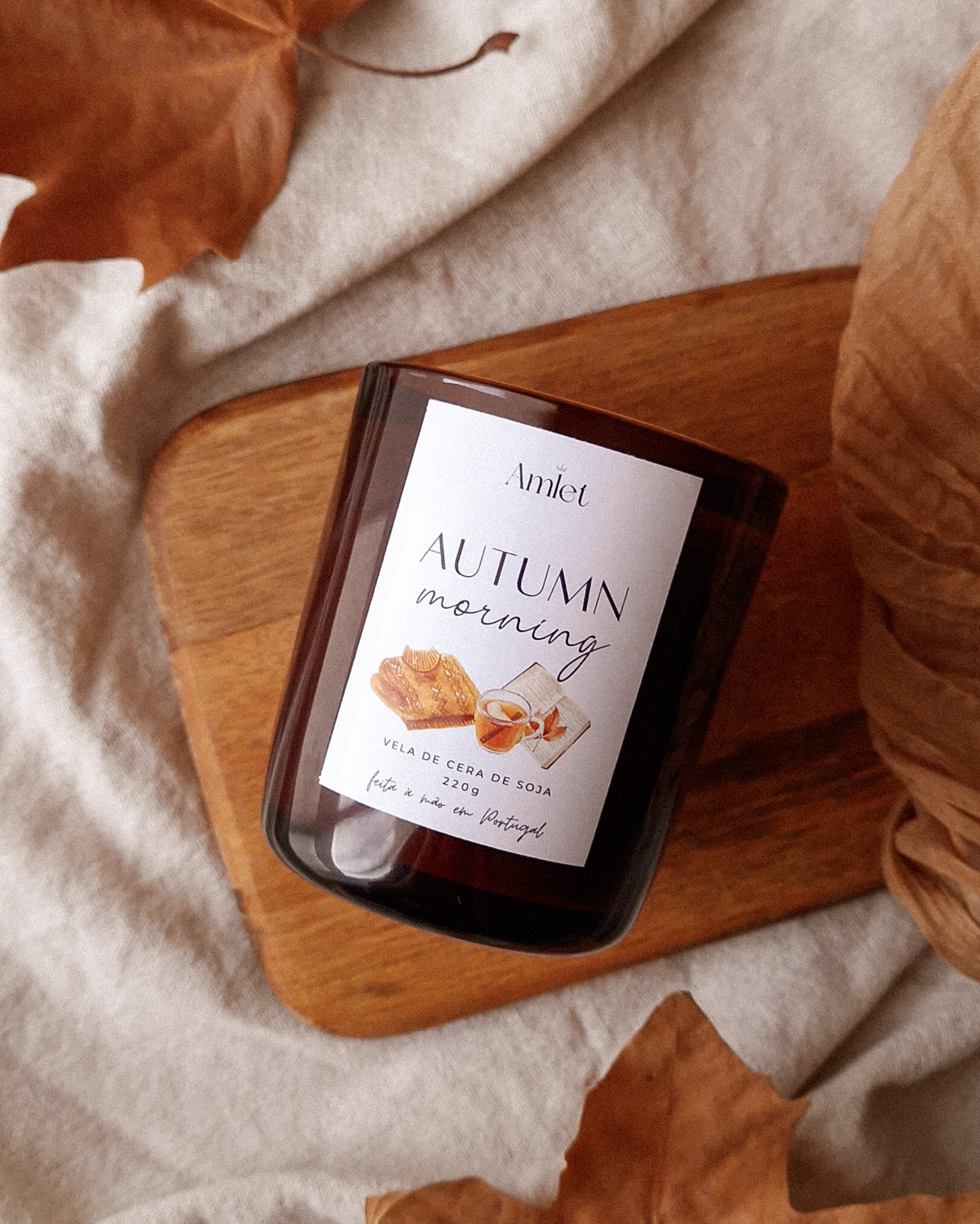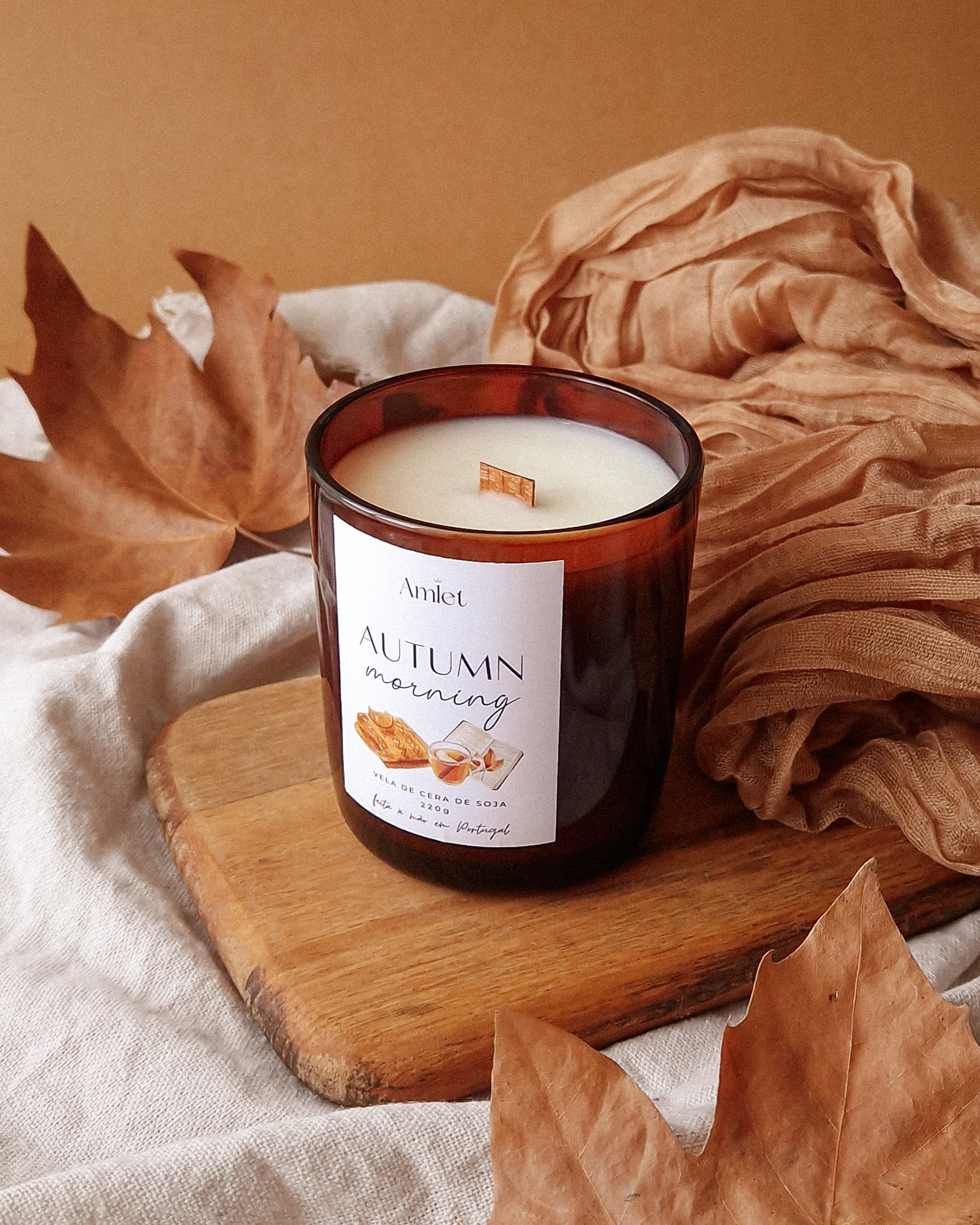 Abraça a serenidade de uma manhã de outono com a vela Autumn Morning, que promete envolver o espaço com o doce aroma da maçã crocante e um toque de canela quente. O seu copo ambar translúcido acrescenta conforto, enquanto o pavio de madeira, ao crepitar, traz a sensação de lareira acesa.