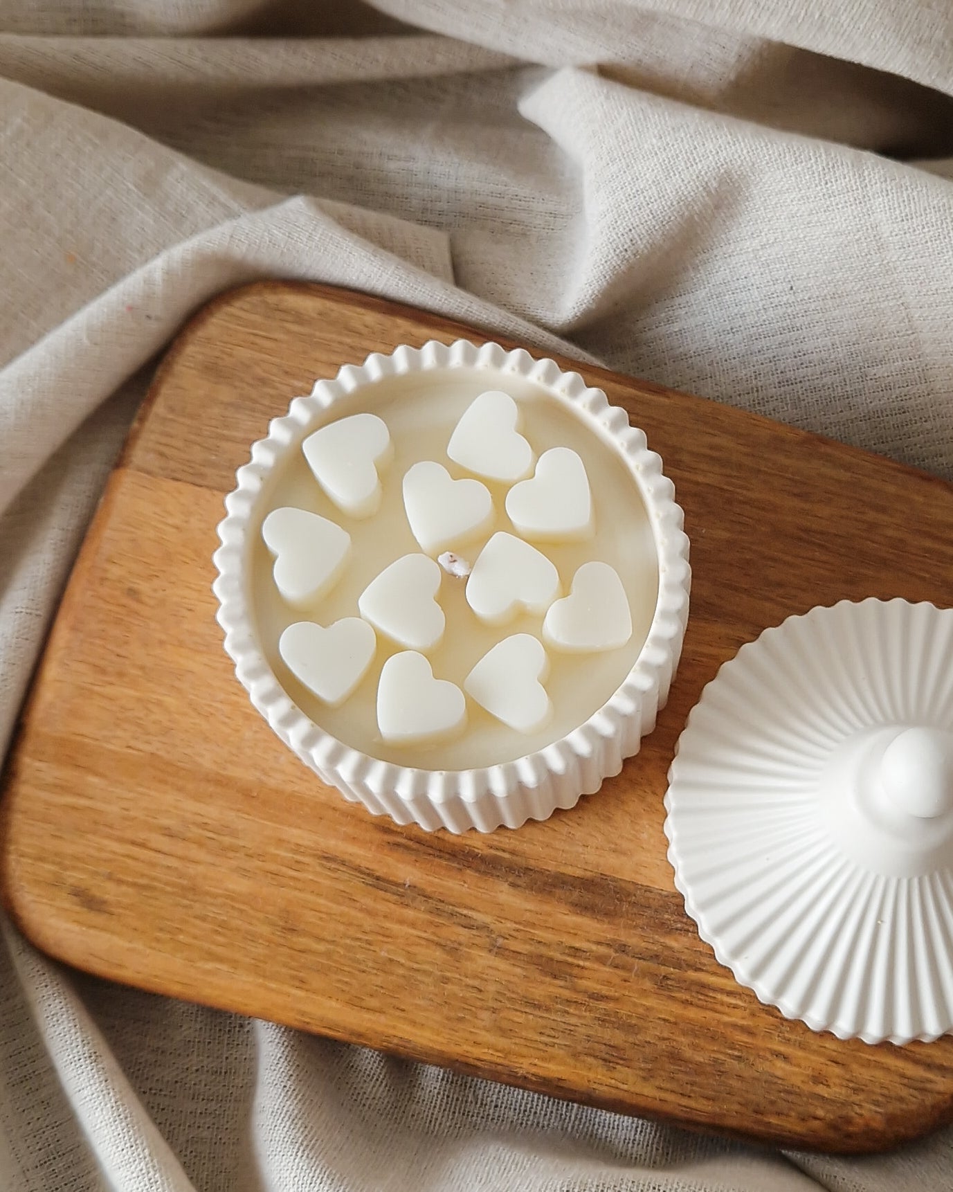 Ingredientes | Resina ecológica, pigmentos naturais, selante natural, cera vegetal de soja, pavio de algodão e aromas não tóxicos |